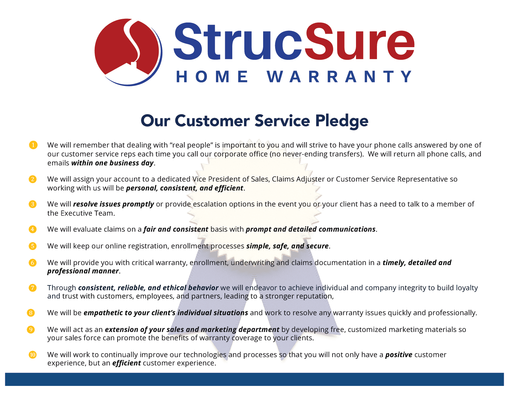 At StrucSure Home Warranty, we take customer satisfaction and your experience with us seriously and it’s our goal to not only provide you with the best risk management products available, but to make working with us easy and efficient.  If for any reason we fail to live up to any aspect of our pledge, please e-mail info@strucsure.com and we will investigate the situation and remedy it.